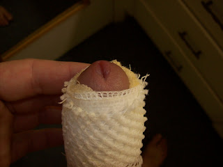 This is the evening of the surgery, the foreskin is history and I am all bandaged up for the night. The procedure its self was a breeze, I had no pain at all and while I was given prescription pain meds I never had them filled, and controlled the pain great with extra strength Tylenol only. I was awake for the whole thing and actually watched the Dr. as he worked and asked many questions and honestly enjoyed seeing how it was performed. In this pic it has been about 8 hours since the surgery.